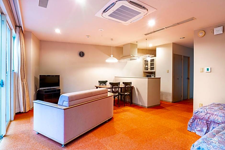 Experience luxury in our spacious "Luxze Hitotsuba" triple room with a Tatami area, perfect for 3 adults and 2 children. Enjoy the convenience of a fully equipped kitchen, a relaxing balcony, and the comfort of both twin beds and a traditional Futon Mat.