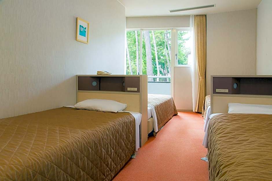 "Experience comfort in our spacious Cottage Himuka, a smoking allowed triple room with 3 twin beds, air conditioning, and a fully equipped kitchen. Relax in the bathtub and enjoy free toiletries in your private bathroom."