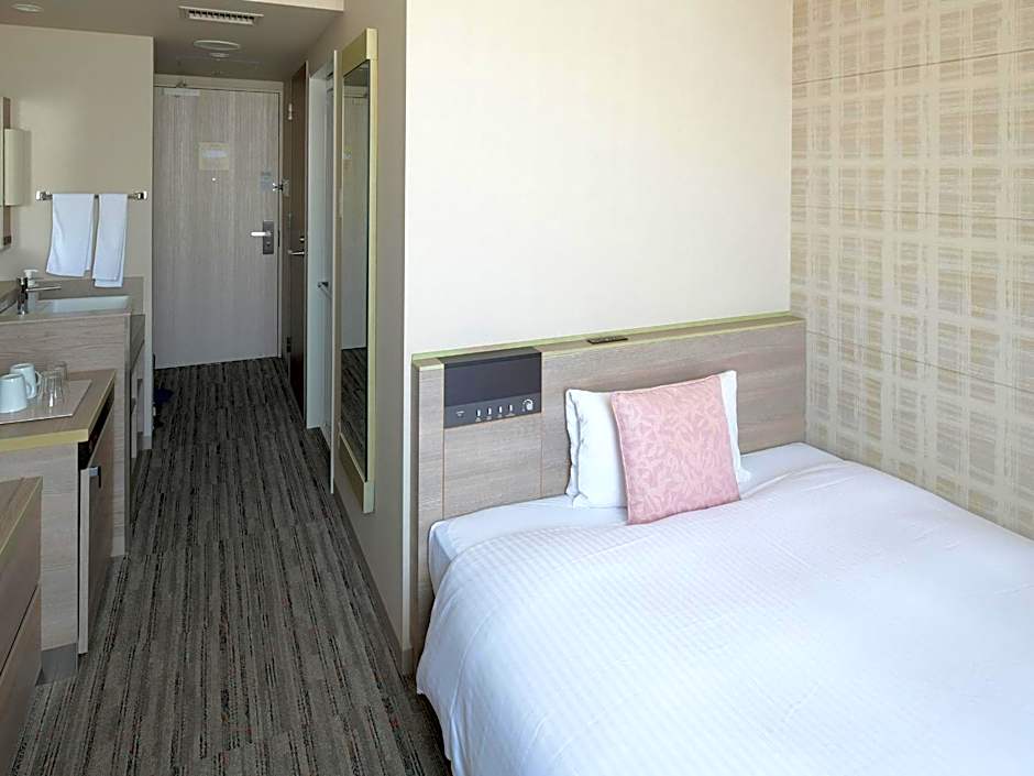 Right in front of the Moriyama train station and across the street from a 24h supermarket.The single room is compact but very comfortable. They provide free drinks in the lobby area.