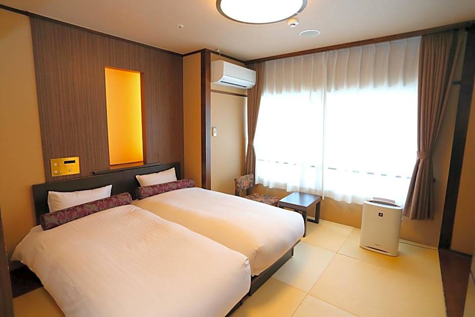 This quadruple room's special feature is the sauna. The quadruple room provides air conditioning, tatami, as well as a shared bathroom featuring a bath and a shower. The quadruple room offers a wardrobe, a safe deposit box, an electric kettle, a carpeted floor and a flat-screen TV. The unit offers 2 beds and 2 futons.
