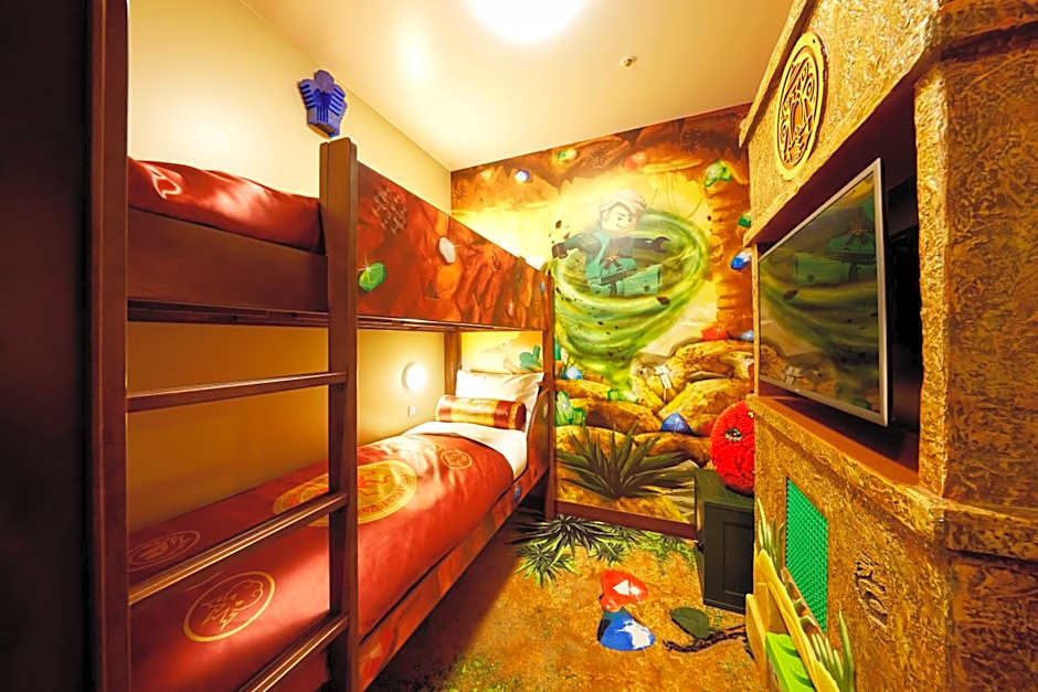 The LEGOLAND Japan Hotel offers various types of rooms with different themes. These include Suites, Quadruple rooms, and Family rooms. The rooms have a size of 323 sqft or 484 sqft. All rooms are non-smoking and can accommodate either 2 adults and 2 children or 2 adults and 3 children. The beds available in the rooms include a Queen size bed, a Bunk bed, a Twin bed, or a combination of these. Additionally, some rooms offer park views.