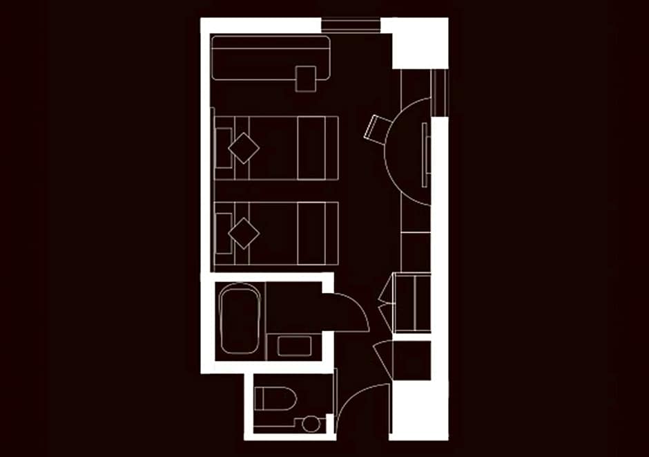 Deluxe Twin (1 Pax) is 269 square feet and includes 2 single beds 80-130 width plus safe.