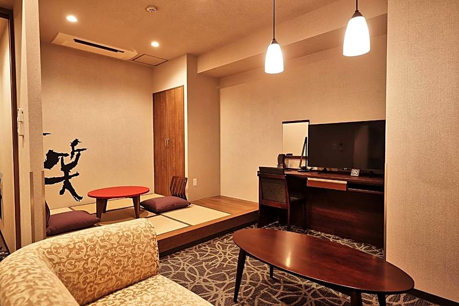 This twin room features a hot tub. The spacious twin room features air conditioning, tatami, as well as a private bathroom boasting a bath and a shower. The twin room's kitchenette, which has a refrigerator, is available for cooking and storing food. The twin room provides a flat-screen TV, an electric kettle, a sofa, a carpeted floor as well as city views.