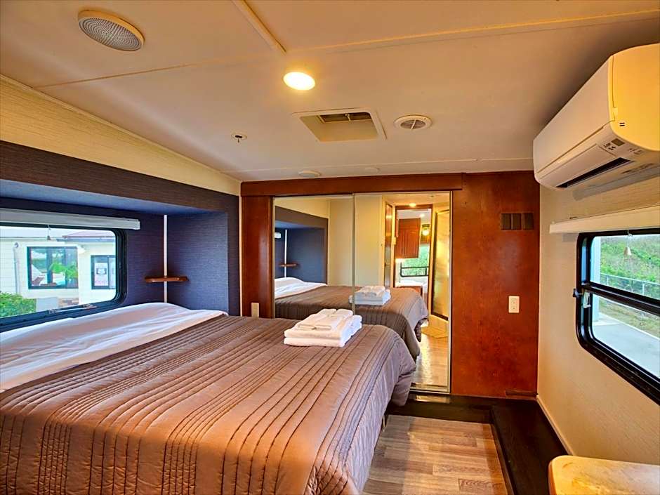 The on-site restaurant only served at dinner time and you have to have made a reservation the night before to be able to eat there and it's only one type of food, yakiniku. You can't cook in the RV's but there is a microwave to warm food and a refrigerator. Make sure to pick up some groceries before arriving. The mattress was thin and far from comfortable but it was alright.