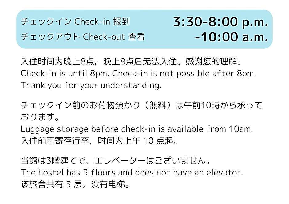 I enjoyed my stay so much! The Japanese staff were amazing and kind and so helpful! He carried my suitcase up to the 3rd floor when I checked in and insisted on carrying it back down when I checked out. The hostel was so clean and the kitchen was equipped perfectly to cook a nice meal. I really loved staying at this hostel. Thank you to the really kind, amazing staff that made this stay really pleasant. Also a perfect location! Right in the town centre and a 30second walk to the station!