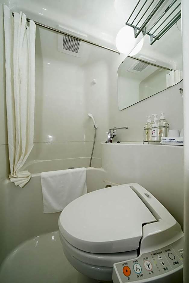 Amenities include free Wifi, free air conditioning, free hot spring bath, non-smoking rooms, elevator, bidet, free toiletries, bathtub, and upper floors accessible by elevator. Private parking and on-site parking are available for an extra charge.