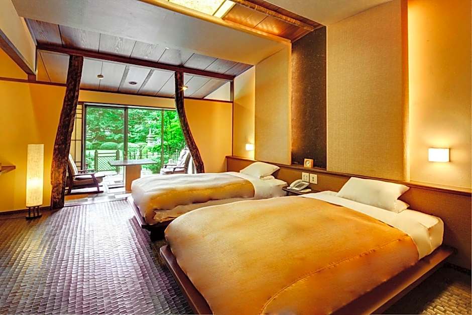 This twin room's special feature is the private open-air bath. The twin room includes a private bathroom, well-fitted with a bath, a shower, a bidet, a hairdryer and slippers. The spacious air-conditioned twin room provides a flat-screen TV with satellite channels, a seating area, a wardrobe, a safe deposit box as well as garden views. The unit offers 2 beds.