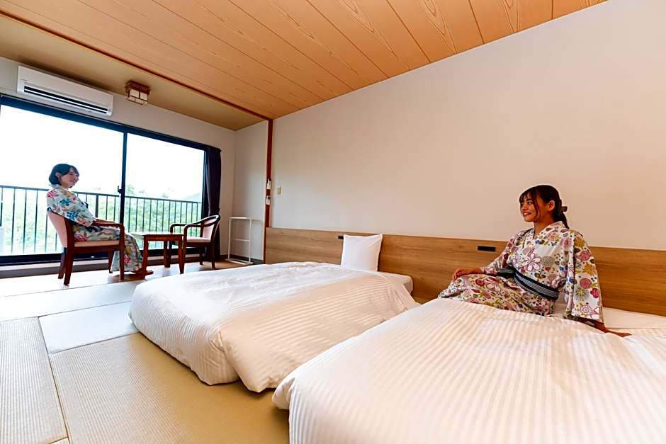 The quadruple room includes a private bathroom, well-fitted with a bath, a shower, a bidet, a hairdryer and slippers. The quadruple room features air conditioning, tatami, a safe deposit box, an electric kettle and a flat-screen TV. The unit has 4 futons.