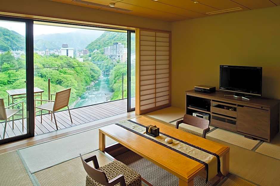 Large rooms featuring an outdoor seating area overlooking Kinugawa River. It has floor-to-ceiling windows, Western beds and a tatami seating area. Amenities include a flat-screen TV, a DVD player and a humidifier, while complimentary tea and Japanese confectionary are provided. Yukata robes and nightwear are furnished. Free Wi-Fi is available.