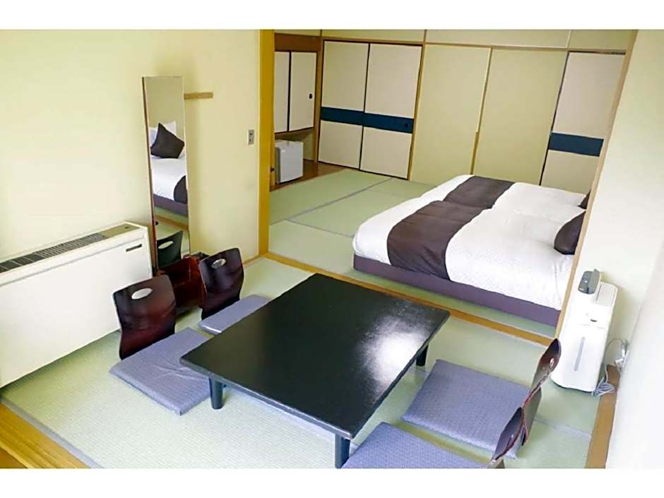 The quadruple room includes a shared bathroom fitted with a bidet, a hairdryer and slippers. The air-conditioned quadruple room offers a flat-screen TV with satellite channels, tatami, a tea and coffee maker, a wardrobe as well as mountain views. The unit has 4 futons.