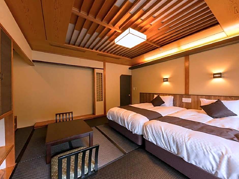 Guests will have a special experience as this twin room provides a private open-air bath. Offering free toiletries and bathrobes, this twin room includes a private bathroom with a bath, a shower and a bidet. The spacious air-conditioned twin room offers a flat-screen TV with satellite channels, tatami, a tea and coffee maker, a wardrobe as well as mountain views. The unit has 2 beds.