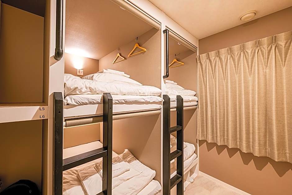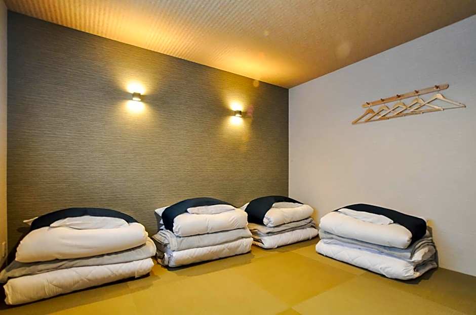 The quadruple room includes a shared bathroom, well-fitted with a shower, a bidet, a hairdryer and slippers. This quadruple room has tatami, heating and a flat-screen TV. The unit has 4 futons.