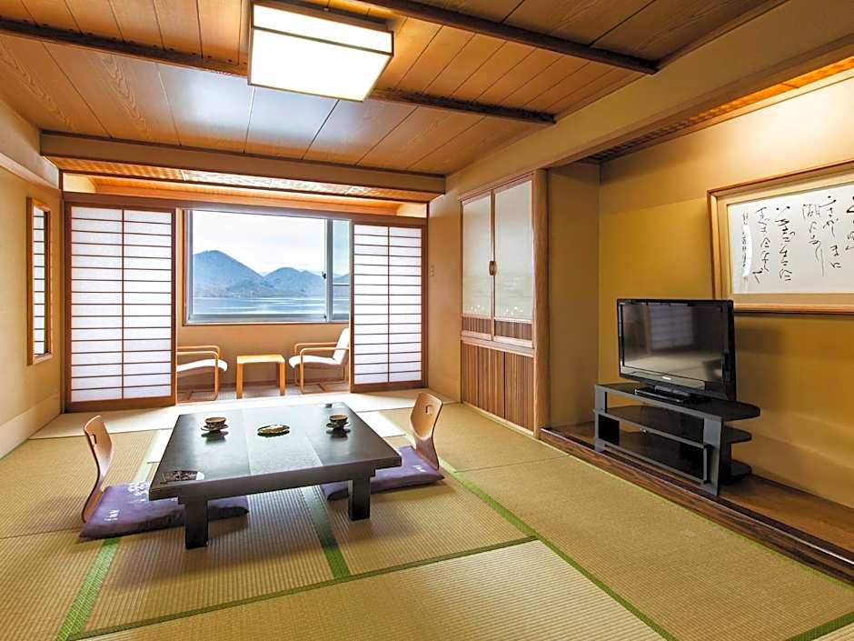 We were surprised by the spaciousness of the room - we had a tatami room with a seating area overlooking the lake. It was just beautiful. Our daughters were so excited to sleep on futons for the first time. It is so relaxing to hang out in a yukata, sip green tea in the room, eat the amazing buffet food and then soak in the lovely onsen. The outdoor rotemburo baths are slightly nicer in one of the baths than in the other, but the men/women signs are rotated twice a day so everyone gets a chance to try both. We had great fun playing bingo at 8pm in the lobby. There were lots of Chinese guests who were very friendly. Overall, a great atmosphere in the hotel, and a lovely room.