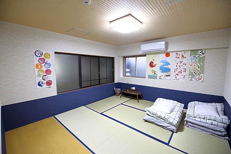 The quadruple room provides air conditioning, tatami, as well as a shared bathroom featuring a shower and a hairdryer. The unit offers 4 futons.