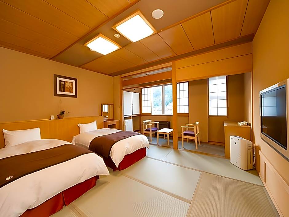 The twin room features a shared bathroom, air conditioning, tatami, as well as a seating area with a flat-screen TV. The twin room offers a wardrobe, a safe deposit box, an electric kettle, yukata and a TV. The unit offers 2 beds.