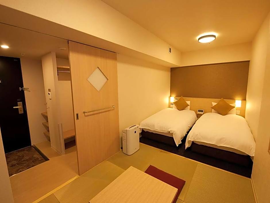 The twin room includes a private bathroom, well-fitted with a bath, a shower, a bidet, a hairdryer and slippers. The twin room features air conditioning, tatami, soundproof walls, a tea and coffee maker, as well as a flat-screen TV. The unit has 2 beds and 2 futons.