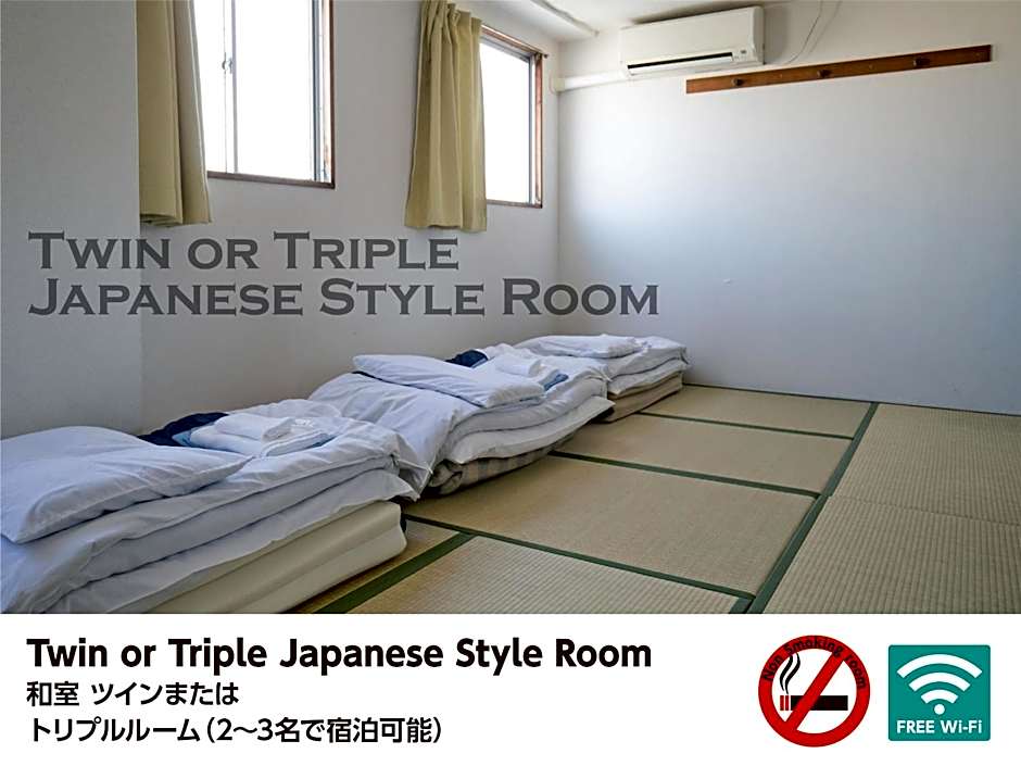 Japanese-style room features tatami (woven straw) flooring and traditional futon bedding. Comes with a fridge and a flat-screen TV. Toilet and bathroom facilities are shared.