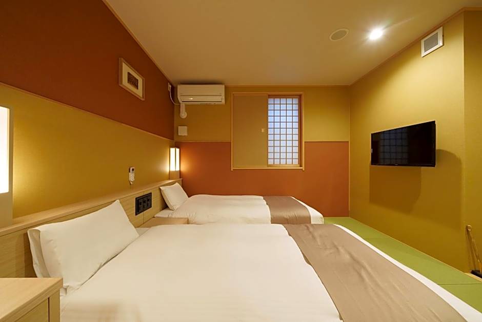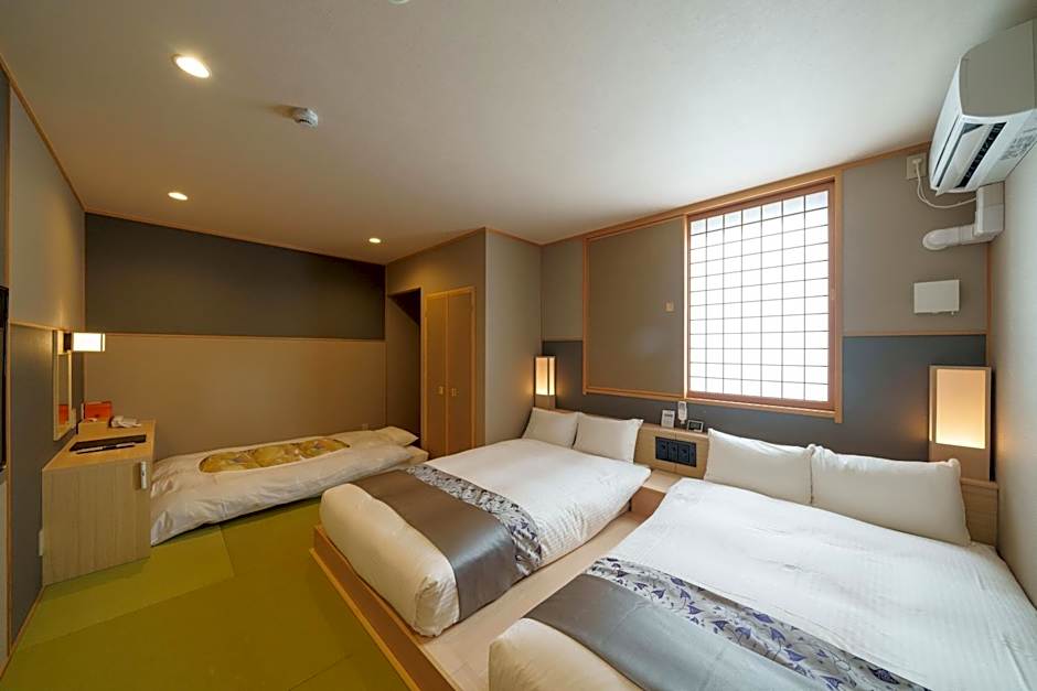 This triple room features air conditioning and seating area. The room has a tatami (woven-straw) floor with an private bathroom and toilet. The bed is 49 in wide, 77 in long with a Serta coil spring mattress.