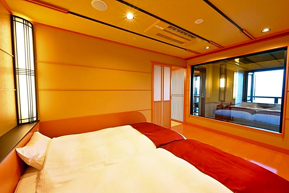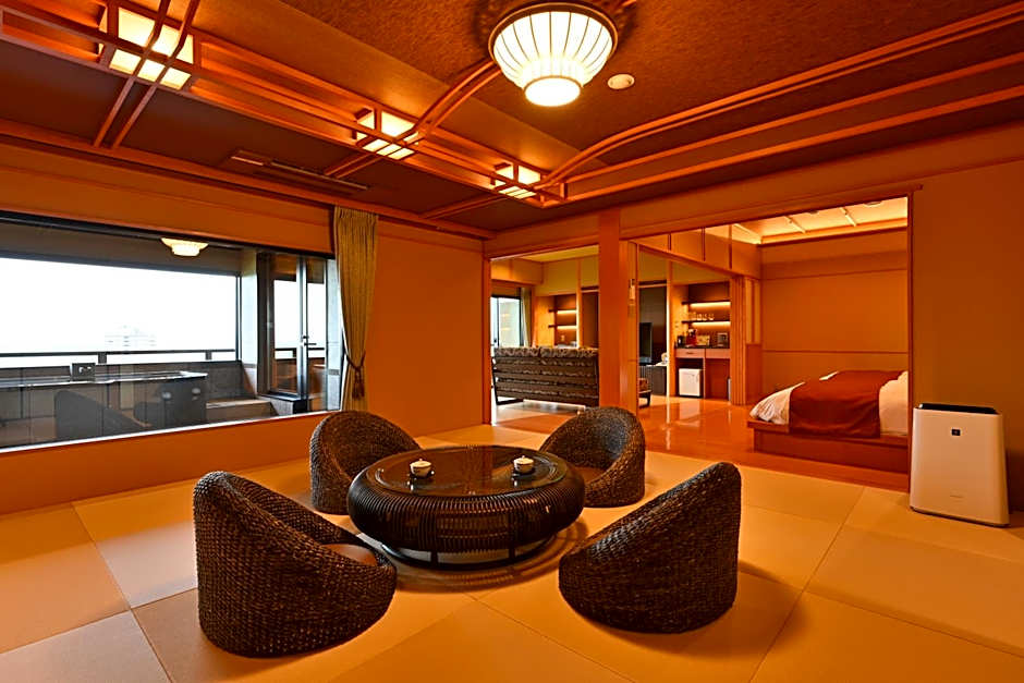 This suite features an open-air hot-spring bath with lake views. It features a Japanese interior with a tatami (woven-straw) floor, a Western living room and Western beds. A balcony, air conditioning is available and an electric kettle, flat-screen TV and air-purifier is equipped in the room.