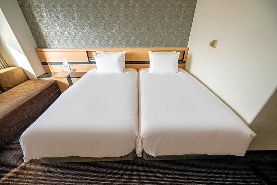 Spacious and well-appointed twin bedroom with ample room to open luggage. Two pillows per person plus an extra pillow provided. Room amenities included a capsule coffee machine, complimentary bottled water, full bathroom supplies, and an air purifier. Convenient location with a nearby station entrance and a Seicomart store next to the hotel. Lovely city view from the 16th floor. Spacious bathroom.