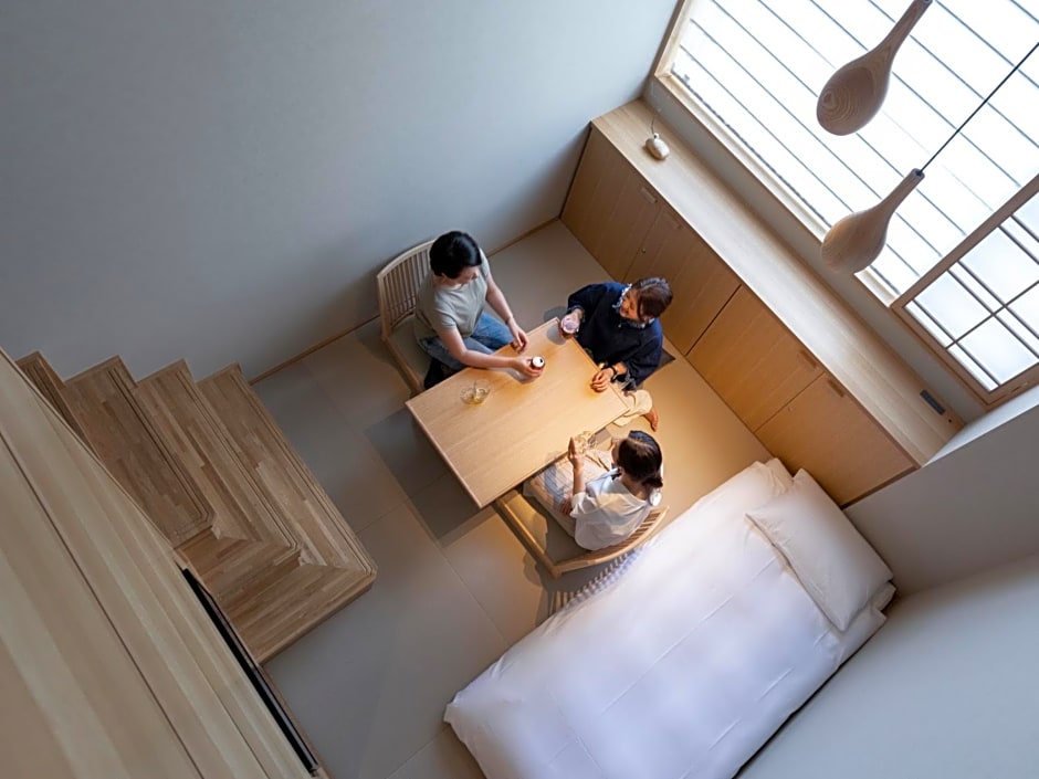 + Location with a Family Mart just next door without having to cross any road + Provides umbrellas for loans + Lobby has a "sunken fireplace" sitting area + Ambience music and zen/ spa-like scent + Room is a cute fusion of modern & traditional Japanese ryokan feel. + Provides things in the room that are useful, helpful and thoughful.