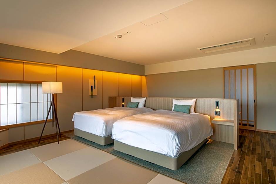 The private open-air bath is a top feature of this twin room. The spacious twin room features air conditioning, a wardrobe, a terrace with sea views as well as a private bathroom boasting a bath. The unit has 2 beds.