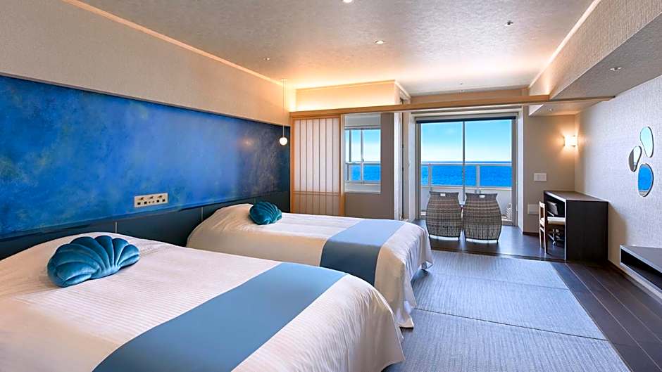 Offering free toiletries, this twin room includes a private bathroom with a bath, a shower and a hairdryer. The air-conditioned twin room offers a flat-screen TV, tatami, a safe deposit box, an electric kettle as well as sea views. The unit offers 2 beds and 1 futon.