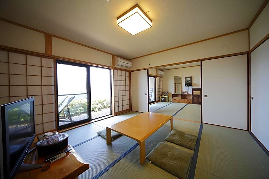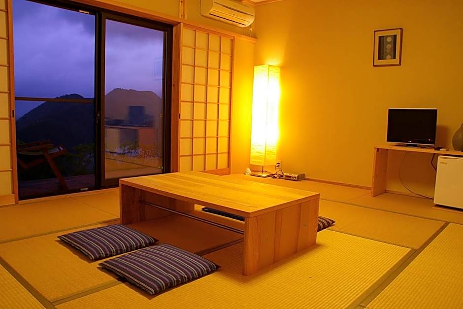 The quadruple room provides air conditioning, tatami, a terrace with mountain views as well as a shared bathroom featuring a bidet. The unit offers 4 futons.