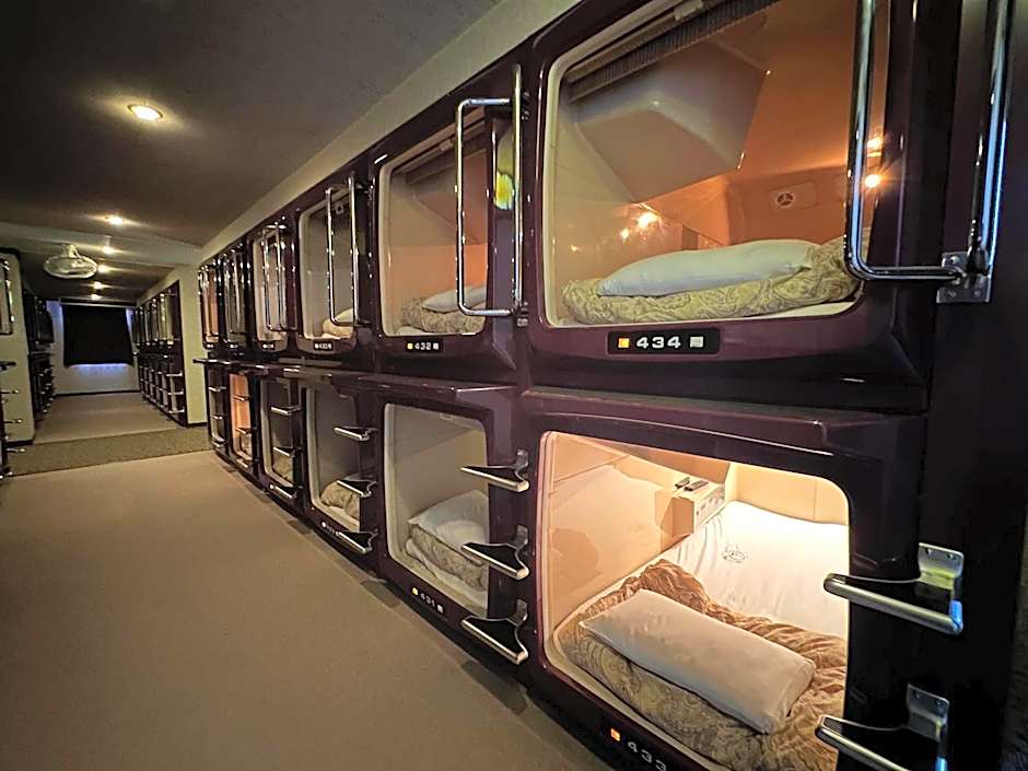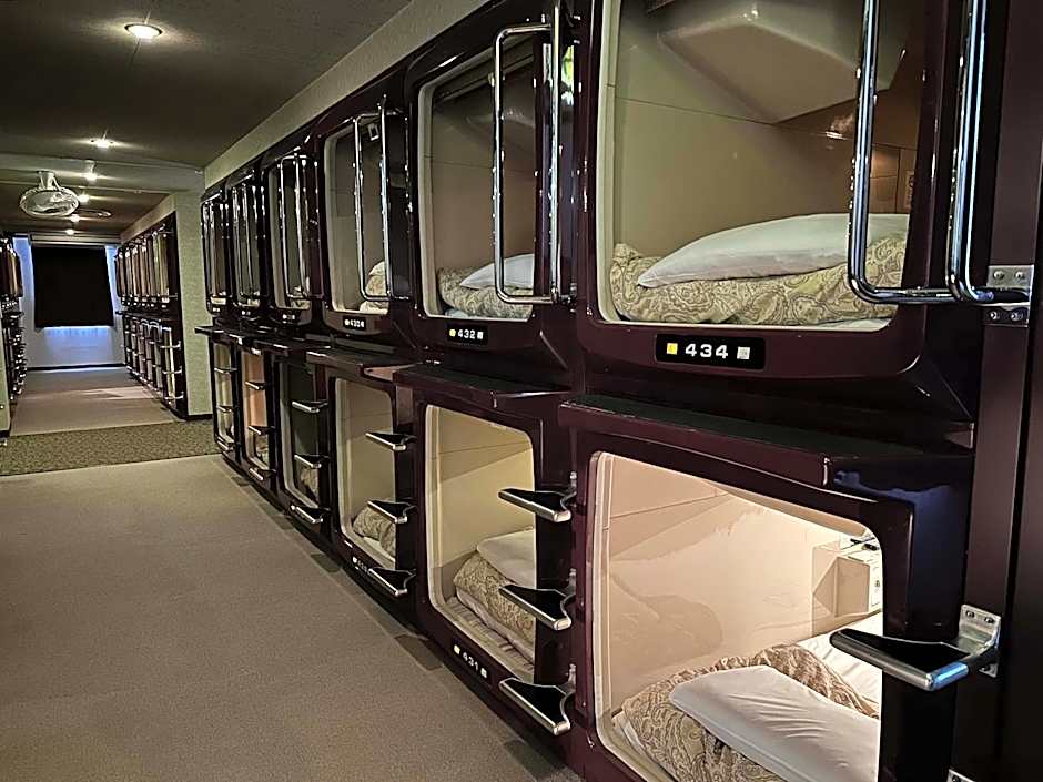 Located in the lower row. A private sleeping capsule in a large shared room. Includes a TV and air conditioning. Men only.