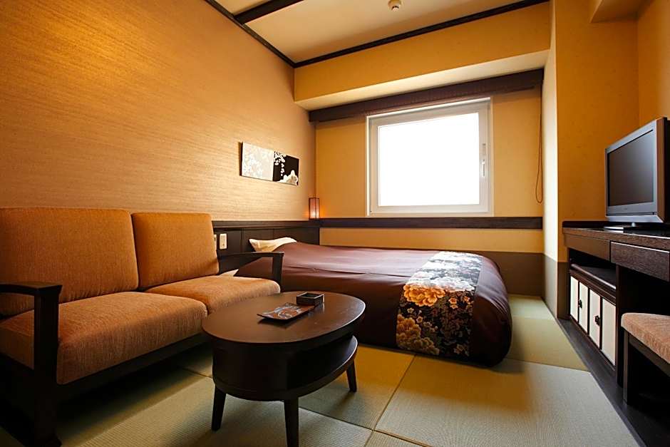 The double room features air conditioning, tatami, as well as a private bathroom boasting a shower and a bidet. The double room offers a flat-screen TV with satellite channels, an electric kettle, pajamas and heating. The unit has 1 bed.