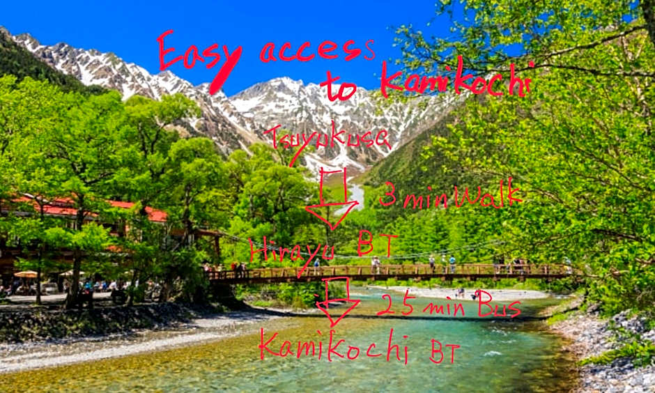 Parking at guest house and walk to bus terminal to Kamikochi. Cheaper than stay in Kamikochi national park. Open air onsen very hot.