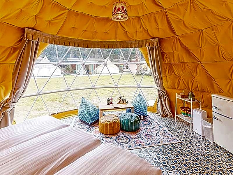 Accommodation options center on a variety of tent setups. Examples include Dome Tent, 4 Single (302 sqft) accommodating 2 adults and 1 child; Clear Tent, 4 Twin (1216 sqft) accommodating 4 adults and 3 children with 4 Twin beds; and Tent, 2 Double (1216 sqft) accommodating 2 adults and 3 children with two Double beds. There are additional tents such as Tent, 4 Twin (1216 sqft) and Dome Tent, 2 Twin to suit different group sizes.