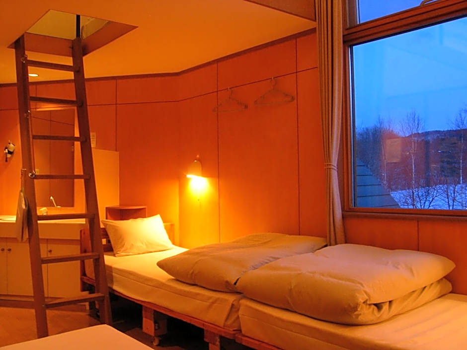 Hostel with rooms set off a hexagonal tower. The hostel is just off route 243 between Bihoro and Teshikaga, Lake Kussharo can be seen from the second floor. It has a large dining / communal area on the first floor, with the toilets and shared bathroom. On the second floor is a small communal room and the rooms/dormitories. My dormitory was split level loft style, 2 beds on the entrance floor and 2 further beds in a loft reached by a ladder. Each bed has access to its own light and power outlet. There is also a switch beside the bed for the room lights. The food is delicious and freshly prepared daily from local ingredients. The hostel also offers cafe meals and snacks and sells alcohol. There are 3 cats in residence, 2 of them really friendly. Just outside the dining room window is a bird table, shimaenagas have been spotted there. Staffe are friendly, helpful. The hostel offers a shuttle bus option to and from Mashu train station.