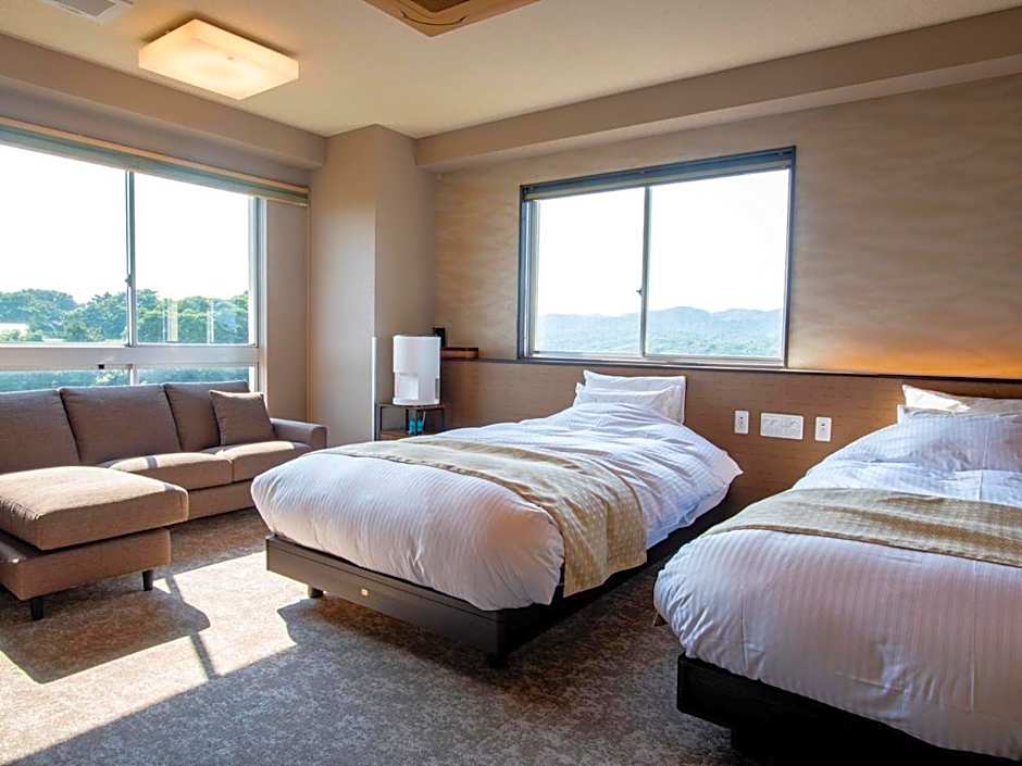 This quadruple room features a hot tub and a sauna. The quadruple room includes a private bathroom, well-fitted with a bath, a shower, a bidet, a hairdryer and slippers. The spacious air-conditioned quadruple room features a flat-screen TV, tatami, soundproof walls, a wardrobe as well as sea views. The unit has 2 beds and 2 futons.