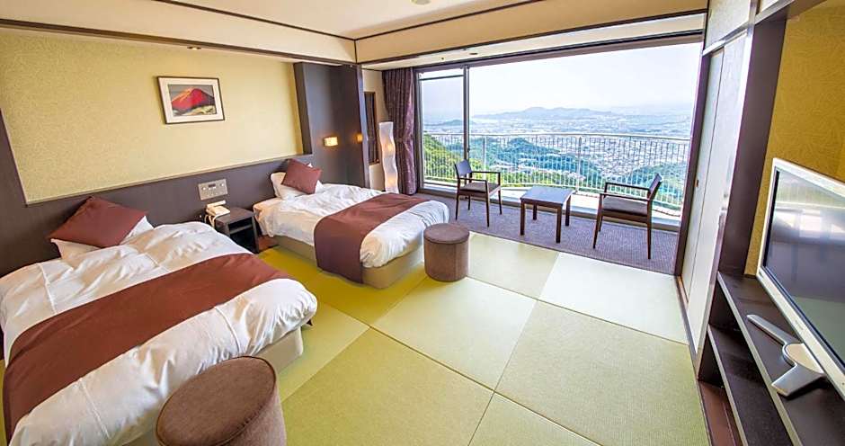 Stand alone hotel on top of a hill overlooking Tokushima city. No traffic, it is a kind of nature reserve. I had a huge tatami room with panoramic windows. Very nice public bath. The room did have a private bathroom but no shower - Ryokan style.