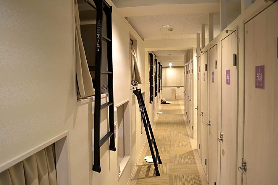 A bigger private sleeping capsule in a large shared room. The capsule is fitted with either double mats or traditional futon bedding on tatami (woven straw) mats as well as a memory foam pillow. Bathrooms and toilets are shared. Women only. Each guest will have a large personal locker with a hanging bar for clothes.