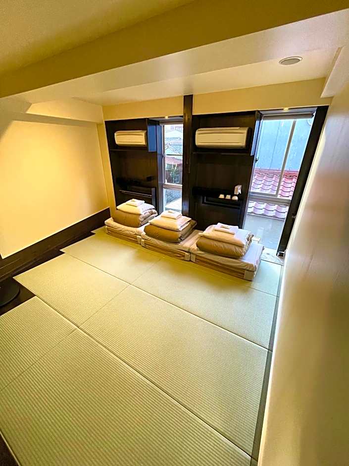 Simple room featuring a tatami (woven-straw) floor and traditional futon bedding. It's fitted with air conditioning, a TV and a DVD player. Toilets and bathrooms are shared.