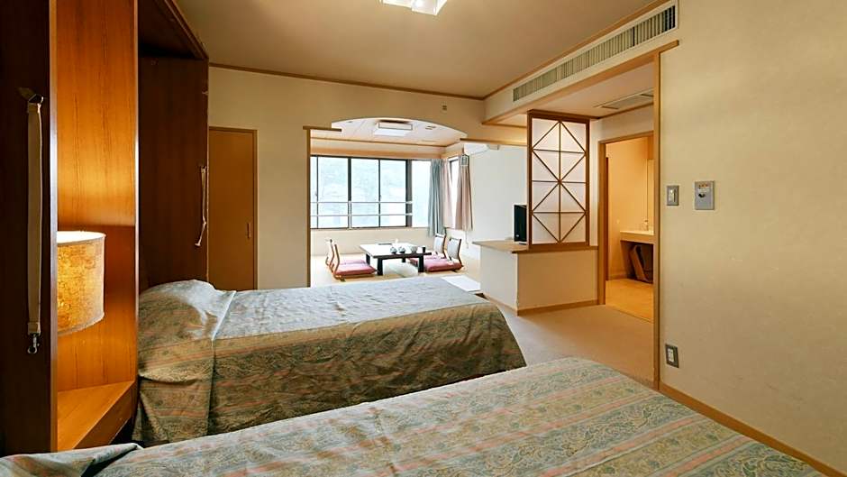 The twin room includes a private bathroom, well-fitted with a bath, a shower, a bidet, a hairdryer and slippers. The air-conditioned twin room features a flat-screen TV, a tea and coffee maker, a carpeted floor and yukata. The unit has 2 beds.