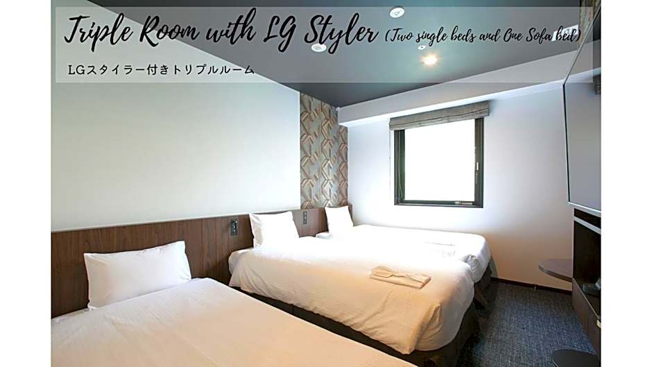 Easy check-in and check-out process. We each got our own comfortable bed (3 beds). The LG Styler was useful to freshen up clothes in between washings, and it was convenient to have coin operated washer and dryer in the lobby. We also liked that we had a mini fridge in the room and access to a microwave downstairs. Pajamas, toothbrushes, washcloths, razors, and q-tips are available for guests in the lobby too. There also is an electric kettle for water and green tea in the rooms. Vending machines, manga library, and a machine/bags for vacuum packing your things also available. While the room was compact, we expected this, and we had room to store and do everything we needed to do in the room. We felt quite comfortable. Room was quiet too. Location in good proximity to stations. Lots of restaurants and stores nearby too.