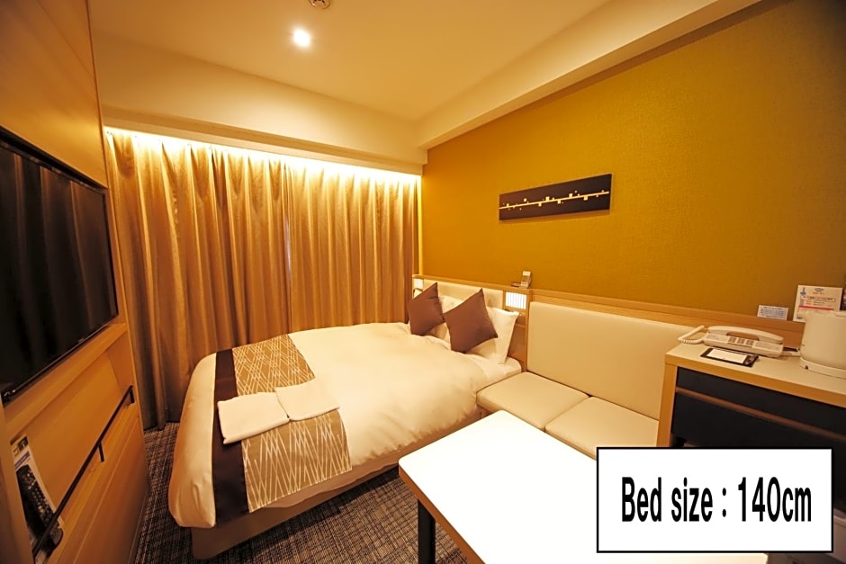 Features a semi-double size bed (47 in wide). The carpeted rooms featuring earth-tone colors are equipped with an private bathroom, air conditioning/heating and a refrigerator. All rooms come with a desk, a flat-screen TV and free toiletries.