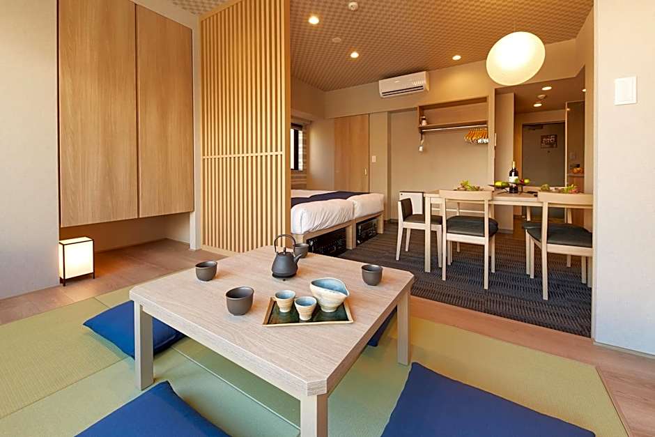 The family room offers air conditioning, a washing machine, as well as a private bathroom boasting a bath and a shower. The fully equipped kitchen has a stovetop, a refrigerator, kitchenware and a microwave. The family room provides tatami, a dining area, a wardrobe, a safe deposit box, as well as a flat-screen TV. The unit has 2 beds and 3 futons.