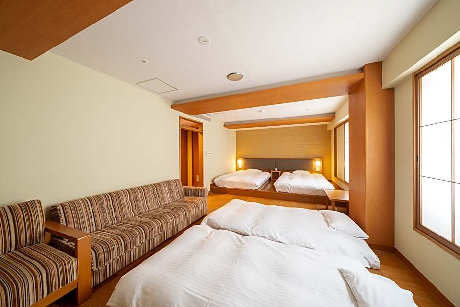 Japanese Western Room Queen beds + Extra Futon, Non Smoking (3 persons) is 398 square feet and includes either 2 king-size beds 150-183 width or a single bed 80-130 width plus hairdryer and slippers.