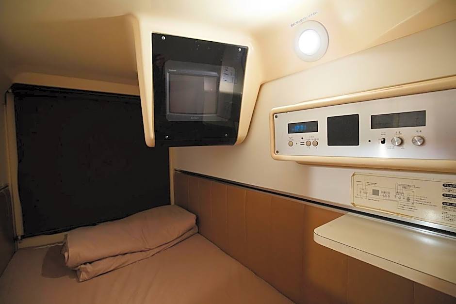 A private, nonsmoking sleeping capsule in a large shared room featuring WiFi access. Bathrooms and toilets are shared. Includes a TV, air conditioning, a power outlet and an alarm clock. Men only.