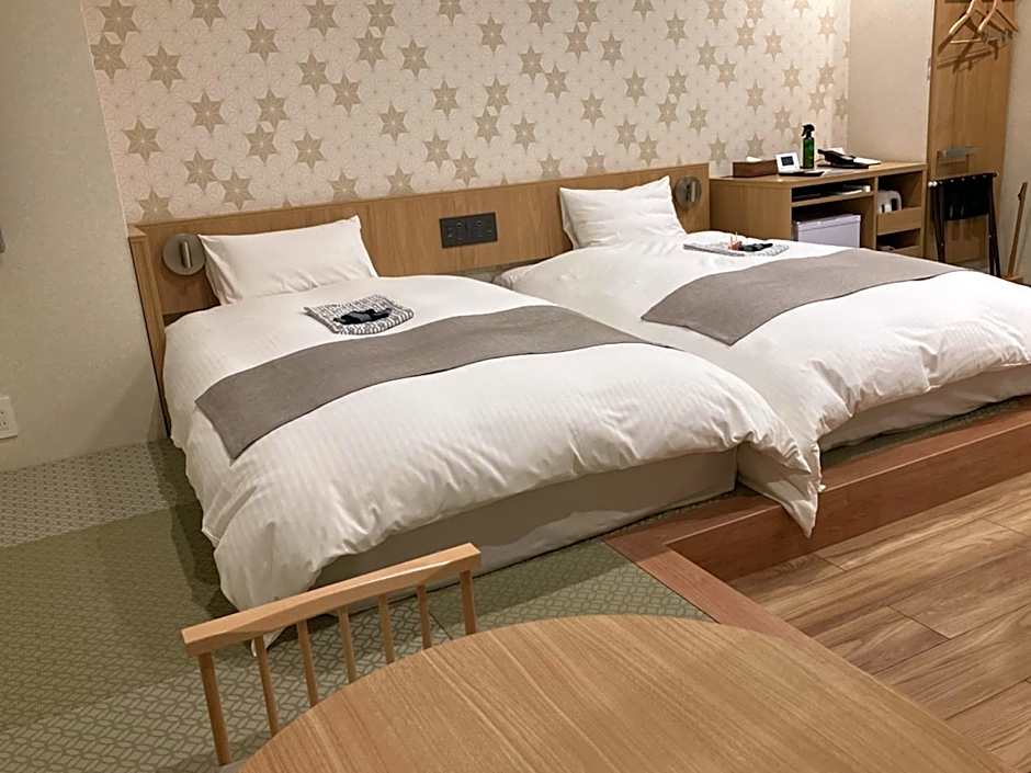 Breakfast was included, a paper voucher for each morning we stayed. It's a self-service buffet with quite a few options, including a waffle maker with green tea and plain mix options. There were a few different cold and hot drink machines too, and an impressive selection of leaf tea (white peach, many green teas, earl grey, rooibos stood out) so hopefully something to suit most people's tastes. The room was nice although a bit cramped around the bed. The bed and pillow were extremely comfortable -- they were much firmer than I expected, compared to the last hotel I stayed at with big very soft pillows. Here you just get one small, dense pillow, but I slept like a log every night except the first, putting that down to jet lag. Shower was plastic and creaked under foot but worked really well, and the toilet... well let's just say it does more for you than I expected, and makes European toilets look like stone age technology. A cotton/polyester yukata robe was provided and replaced/washed every night. No clothes iron but you could request one at the desk. Staff were friendly and spoke enough English for our purposes, although I would strongly recommend learning basic Japanese before arriving because they speak quickly in shops and COVID masks (still a thing in Japan at the moment) make it hard to hear speech clearly.