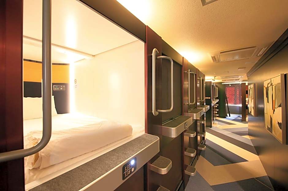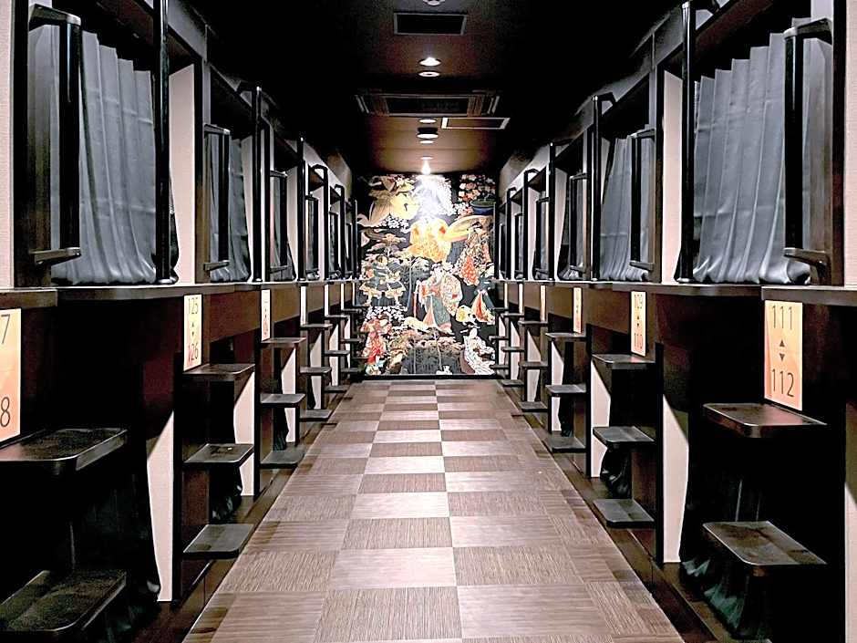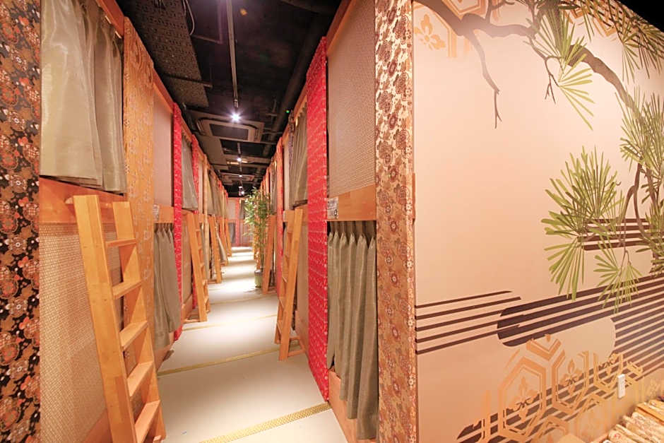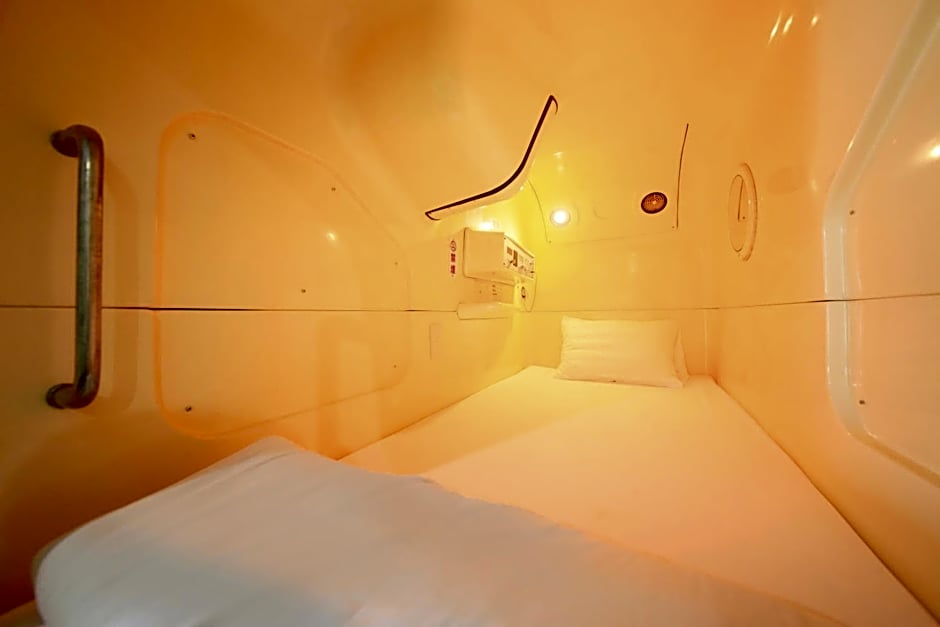 Sleeping options run the gamut from capsules to cabins and dormitories, with male-only configurations appearing across several room types. Examples include Capsule, 1 Twin, Male Only (22 sqft) and Standard Capsule, Male Only (33 sqft) for solo travelers who want privacy, plus larger dormitory and cabin layouts for groups.