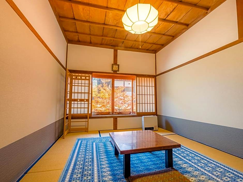 Compact room featuring views of the temple grounds and an LCD TV. Guests sleep in Japanese futons on the tatami (woven-straw) floor. Green tea and yukata robes are also provided. Bathrooms and toilets are shared.