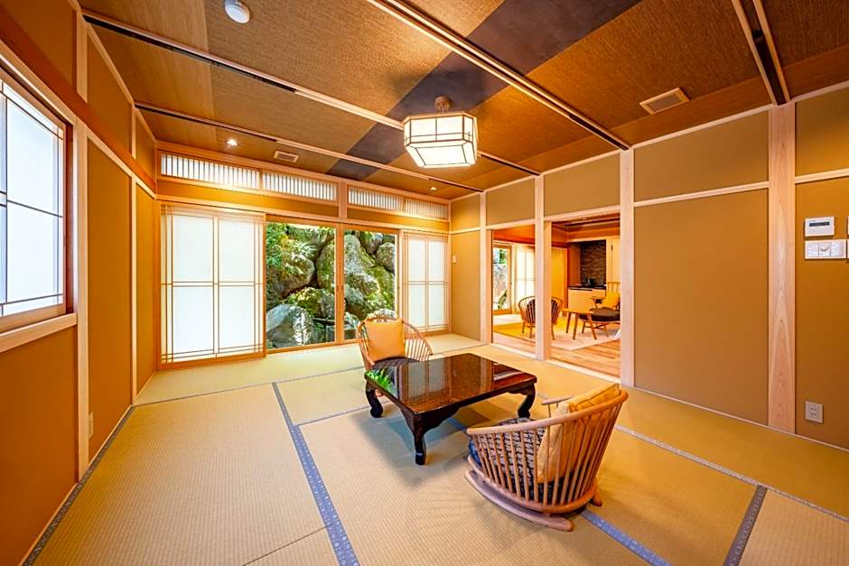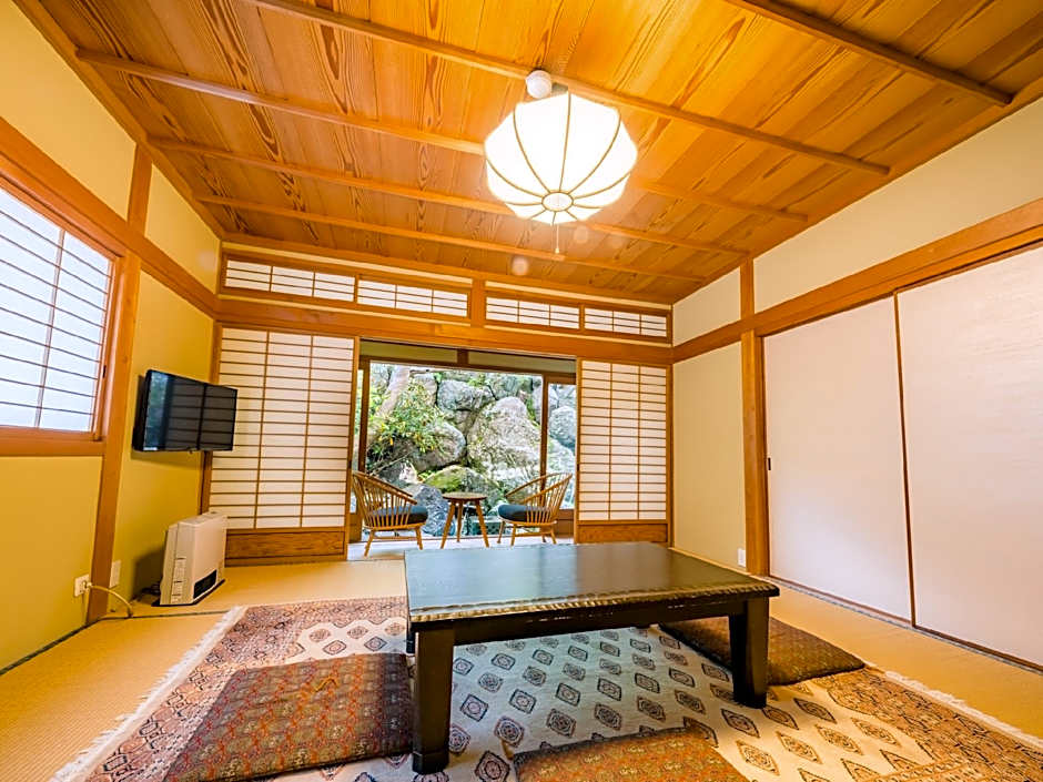 This family room features a view and an LCD TV. Guests sleep in Japanese futon bedding on a tatami (woven-straw) floor. Green tea and yukata robes are also provided. Bathrooms and toilets are shared.
