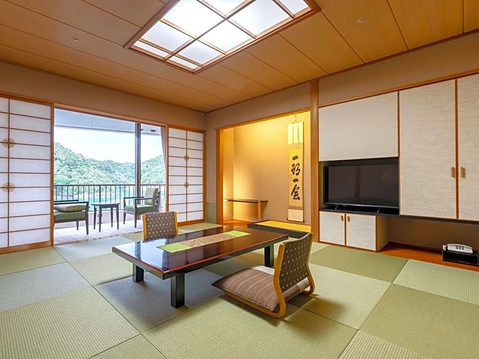 This quadruple room's special feature is the private open-air bath. The quadruple room offers air conditioning, tatami, a terrace with sea views as well as a private bathroom featuring a bath. The unit offers 2 beds and 2 futons.