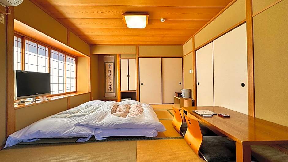 The quadruple room offers an electric kettle, yukata, as well as a shared bathroom boasting a hairdryer and slippers. The air-conditioned quadruple room features a flat-screen TV with streaming services, tatami, a wardrobe, a safe deposit box as well as mountain views. The unit has 4 futons.