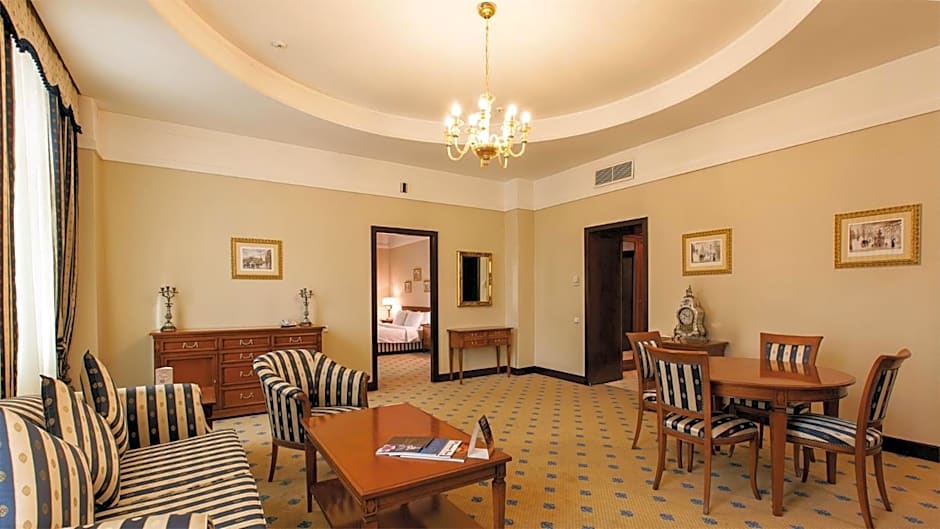 Luxury suite featuring a separate living room with sofa and dining table, and a large bathroom with 2 sinks and corner bath.